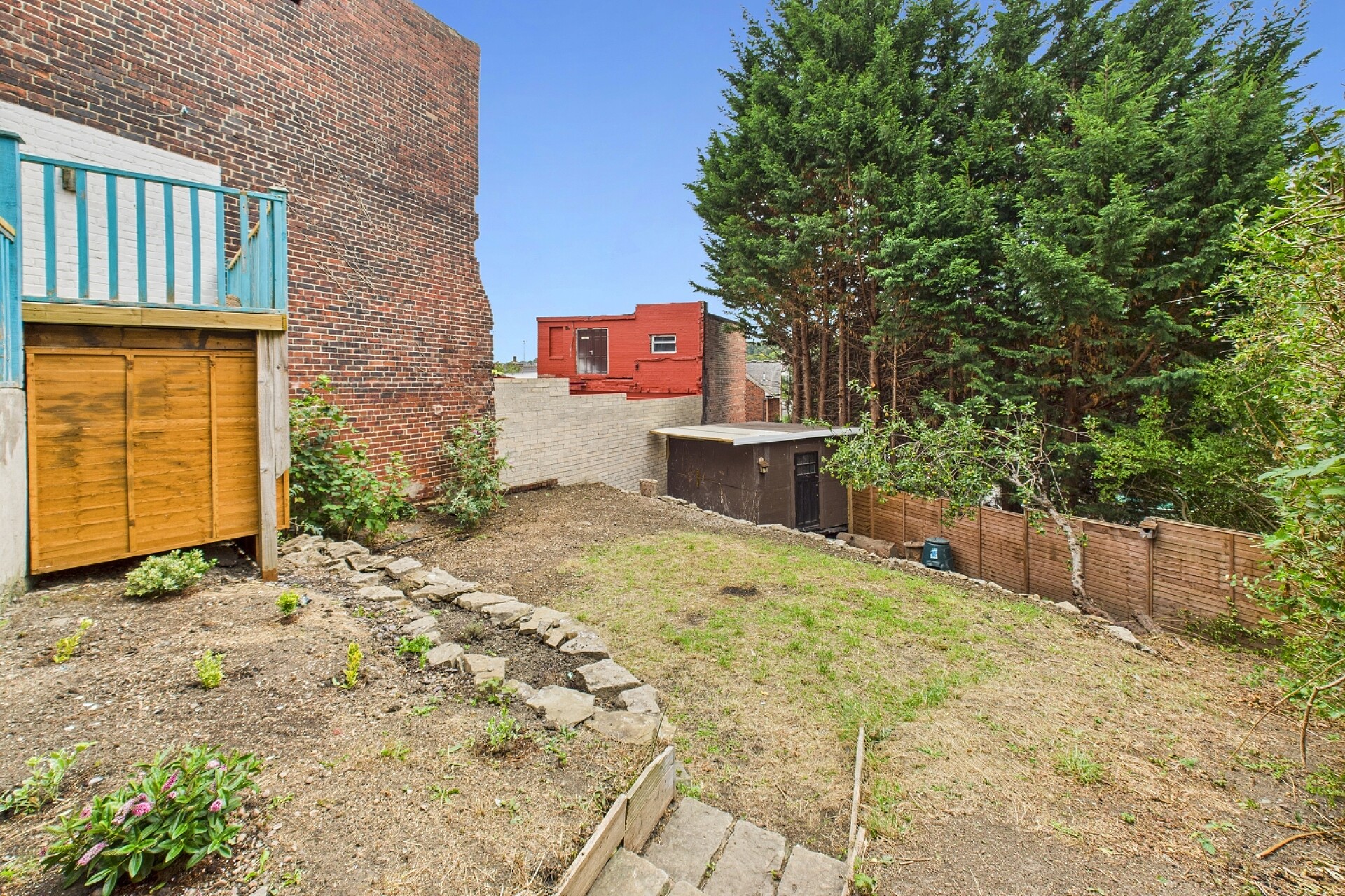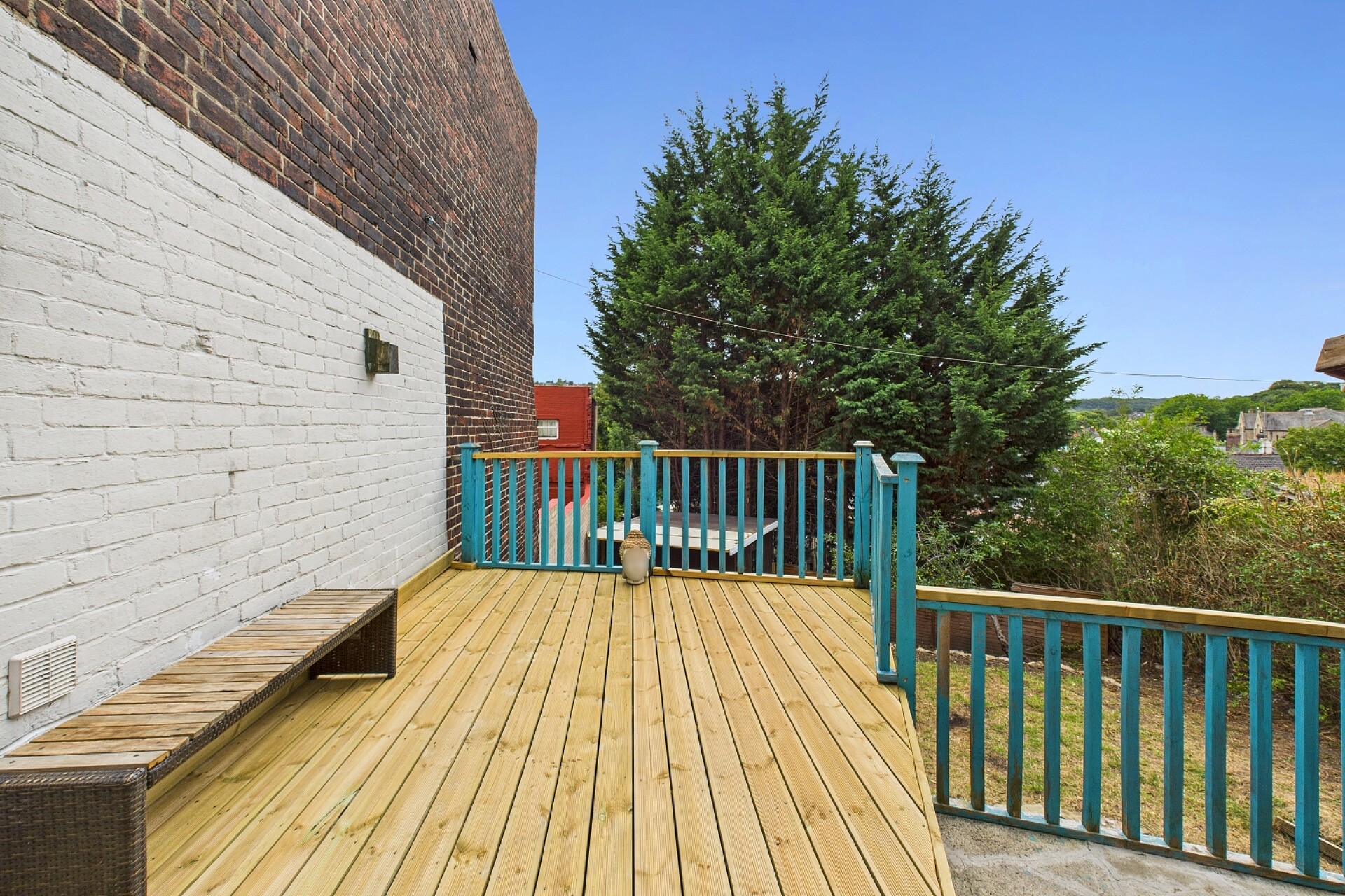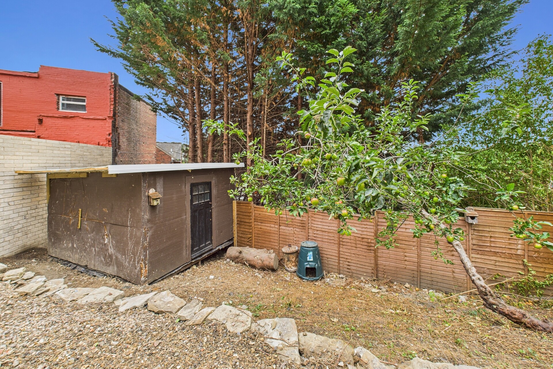To the rear, the home boasts a raised decked area perfect for outdoor dining or relaxing, along with an enclosed lawned garden. At the end of the garden is a versatile garden store that offers excellent potential for use as a home office or studio. Additionally, there is a lower ground storage area providing further practical space.