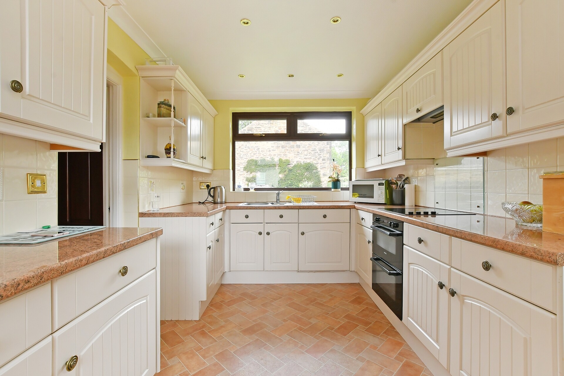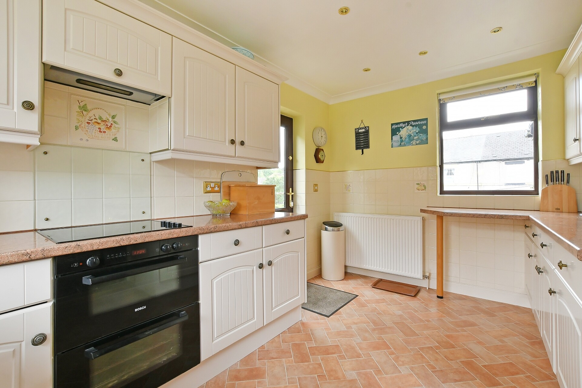 * Kitchen fitted with a range of modern units, ample appliance space, pantry, utility cupboard, and dual aspect windows plus side entrance door