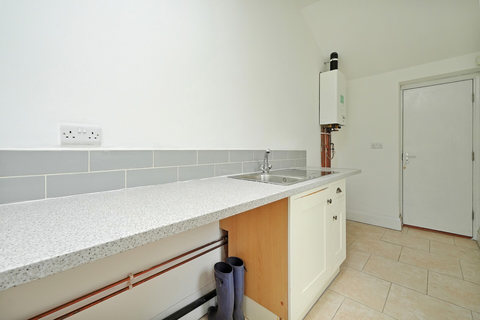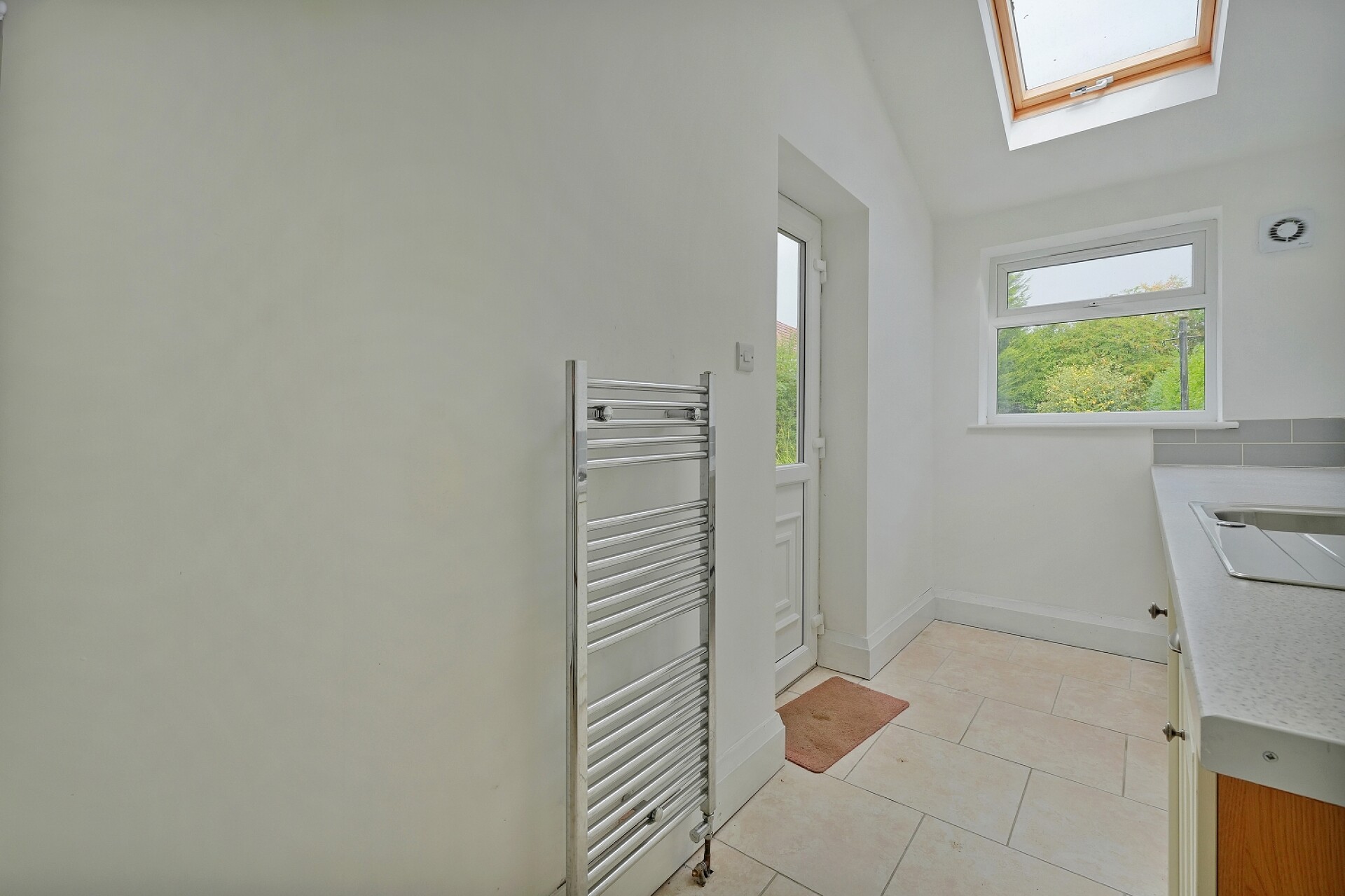 Fitted units across one wall with plumbing for a washing machine and space and space for a tumble dryer and chest freezer. Sink unit and drainer with mixer tap. Granite effect worktops. Chrome heated towel rail, wall mounted combination boiler, rear facing UPVC window, rear facing double glazed Velux window, side facing UPVC half glazed entrance door and internal door opening in to the garage.