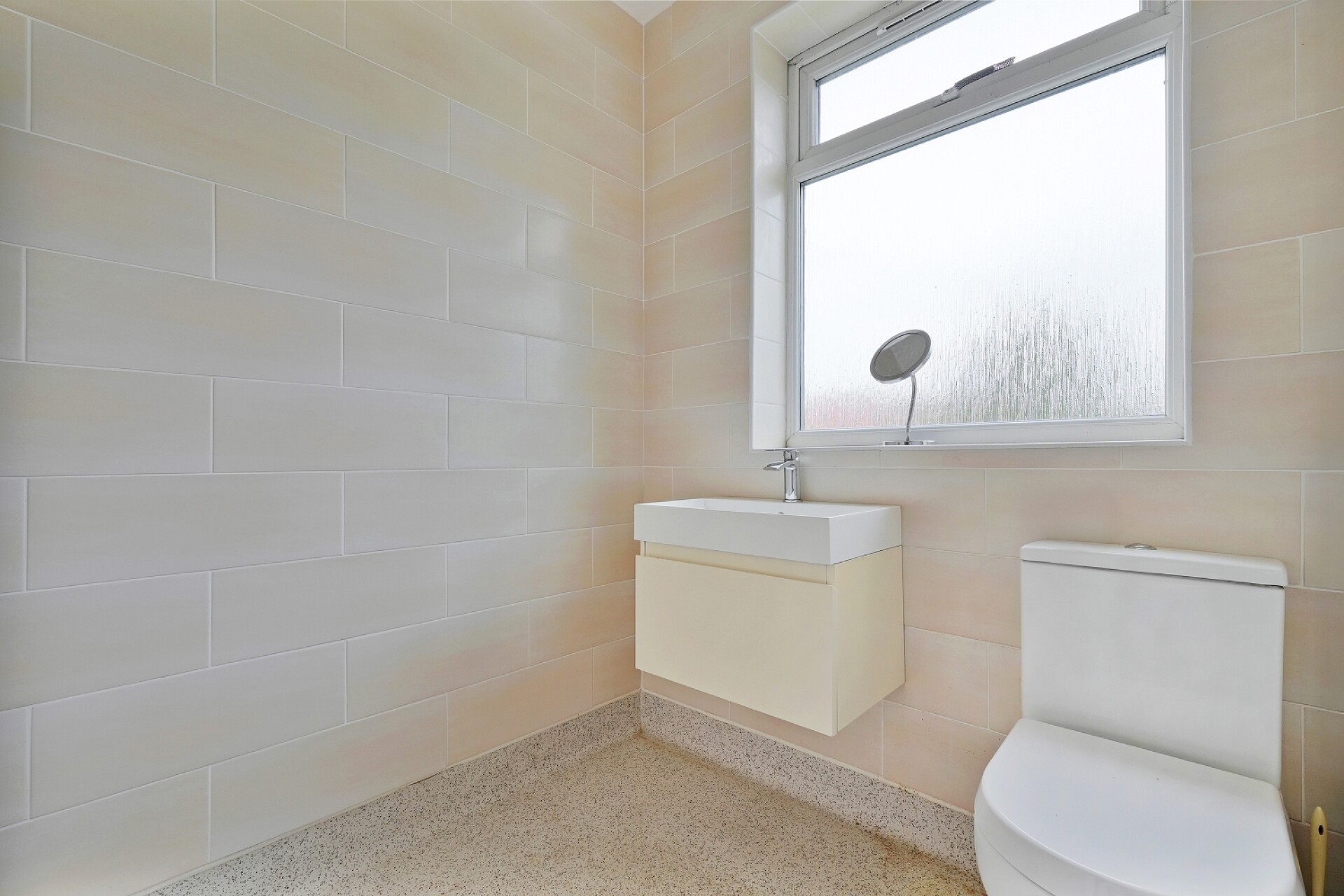Being attractively tiled with a low flush WC, vanity sink unit, Waterfall shower, chrome heated towel rail and rear facing UPVC window.