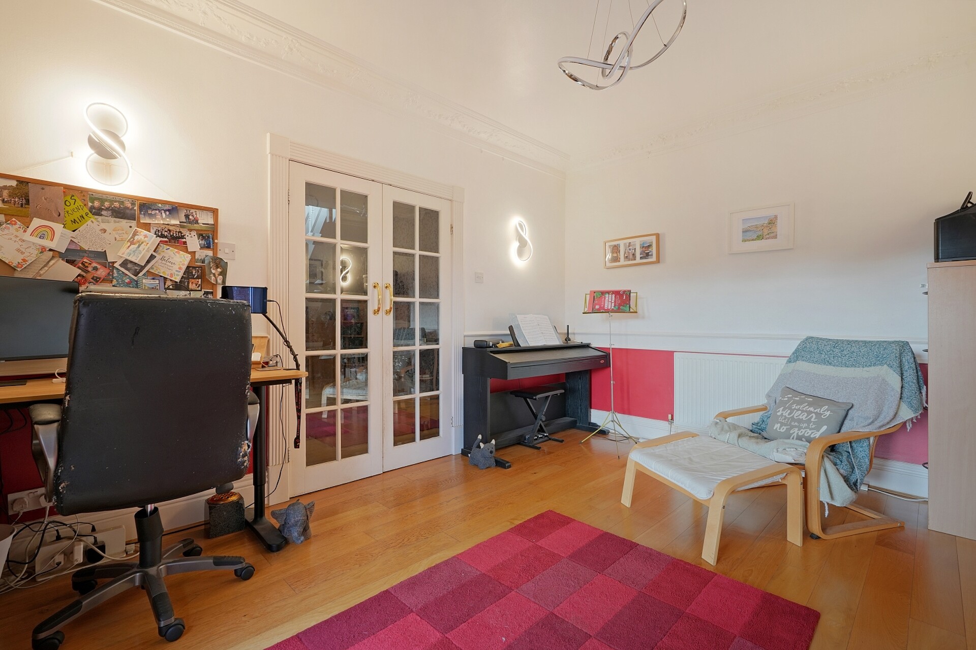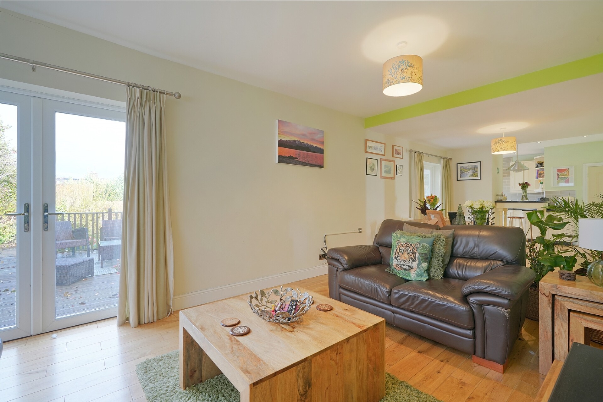 To the right, through double French doors, is the study which could also be used as a fourth bedroom. A tranquil space with natural light available from both the French doors and the patio doors which also open on to the front raised access.