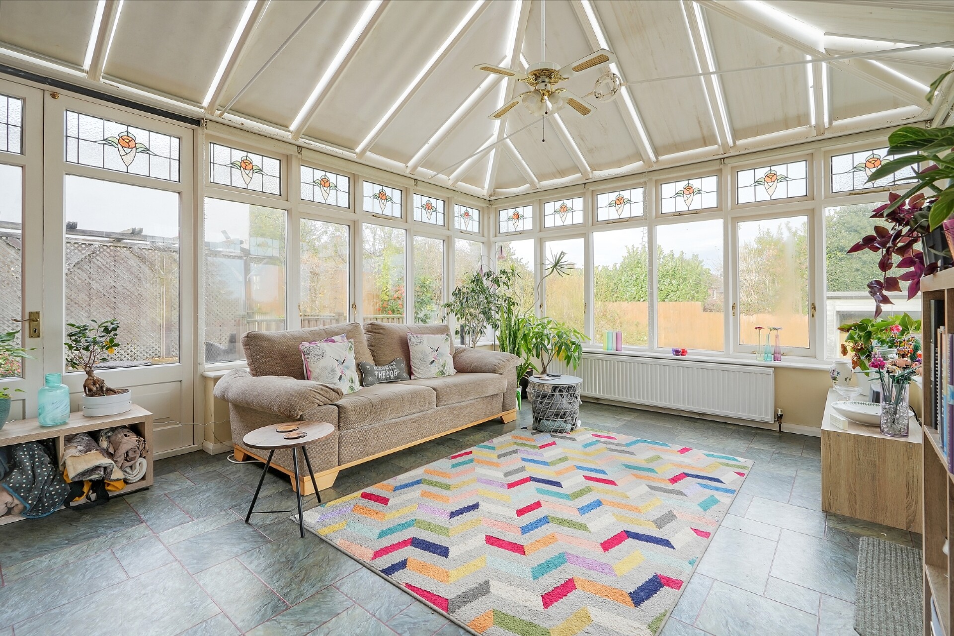 Straight ahead through the double width feature archway, you have the cosy living area to the left with dual aspect lighting from the side window and the patio doors that open on to the patio. This flows seamlessly to a generous dining area that opens into the conservatory and then via a breakfast bar you arrive at the larger than average kitchen.