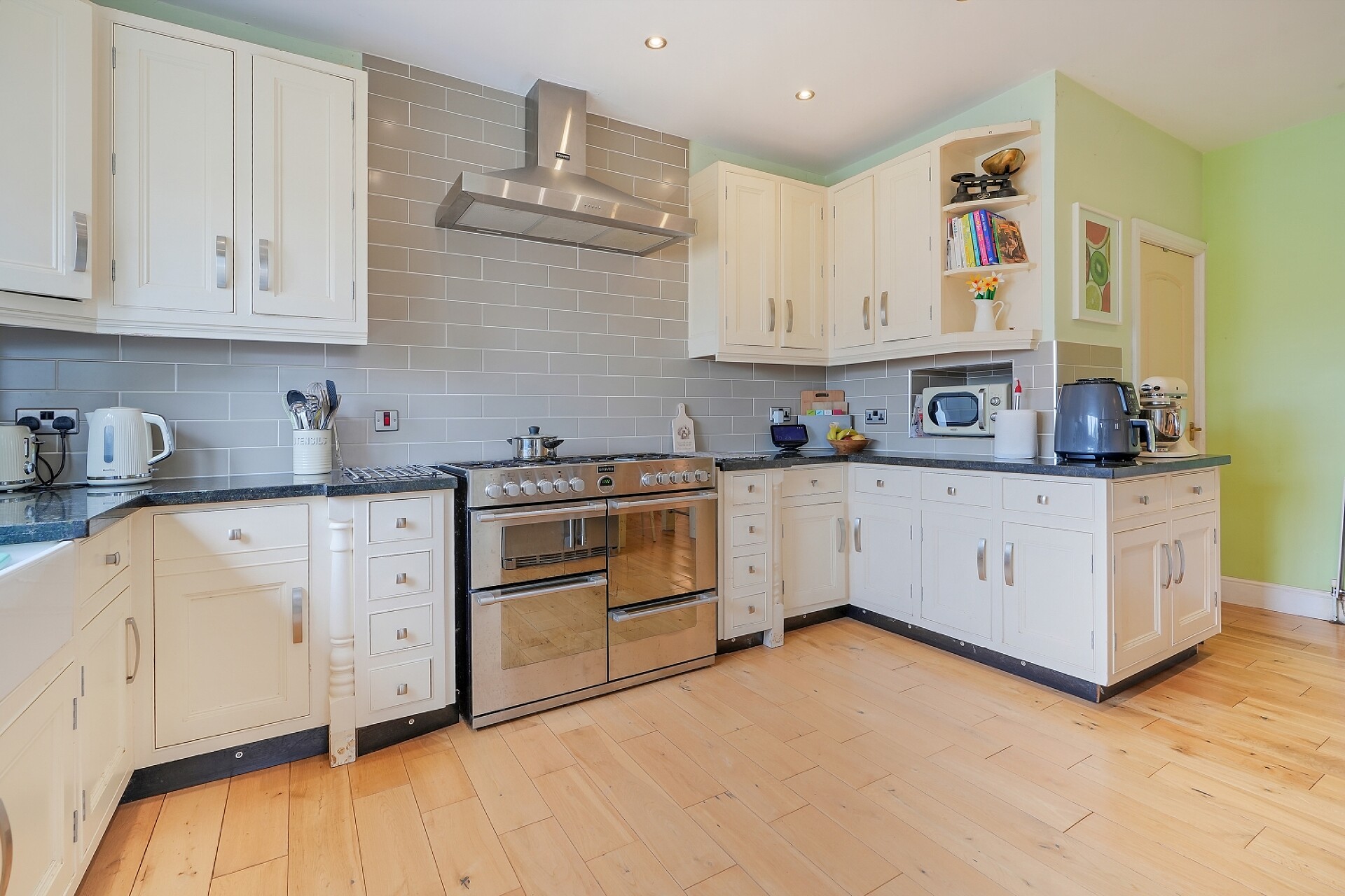 The kitchen has a vast range of fitted wall and base units in cream with contrasting granite worktops and attractive tiling. Appliances include a stoves range cooker with chimney extractor, a NEFF integrated dishwasher and American style fridge freezer.