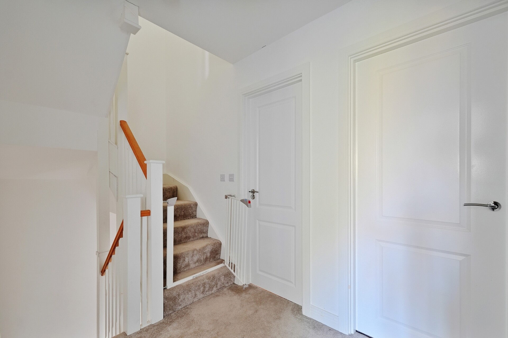 A welcoming and spacious entrance hallway with a front facing UPVC entrance door, under stairs storage cupboard and stairs leading to the first floor.