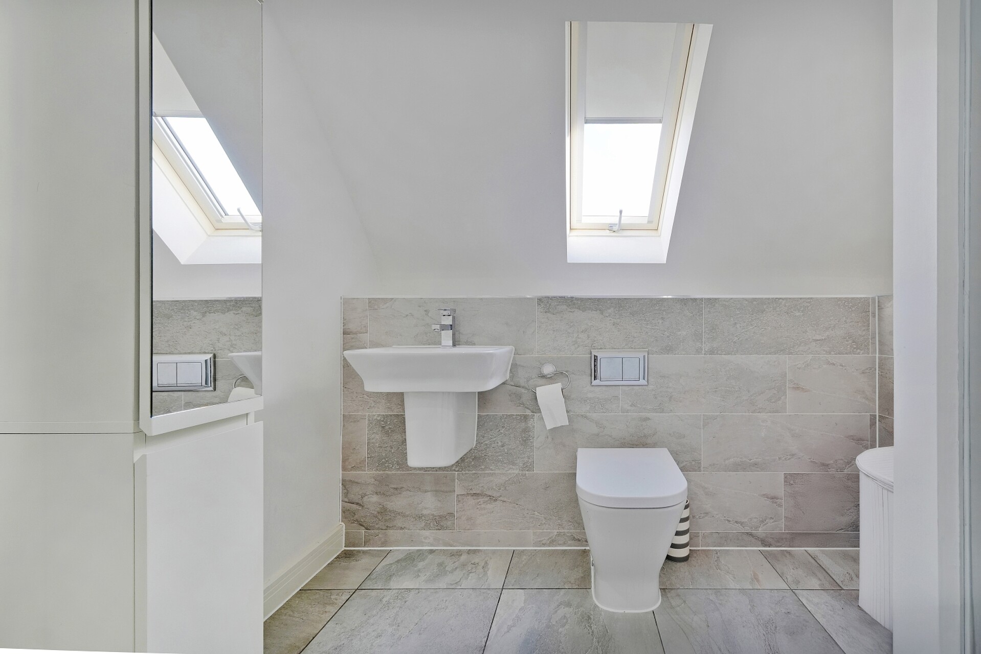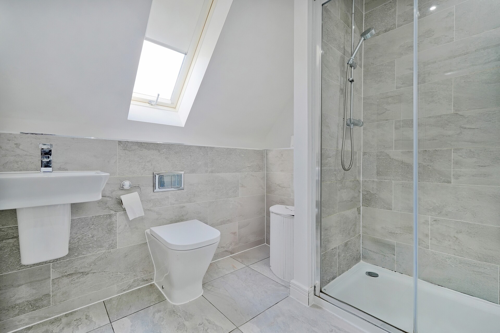 Being beautiful tiled with a suite comprising of a low flush WC, pedestal wash hand basin and bath with waterfall shower above and shower screen. The room also benefits from a front facing obscure glazed UPVC window .