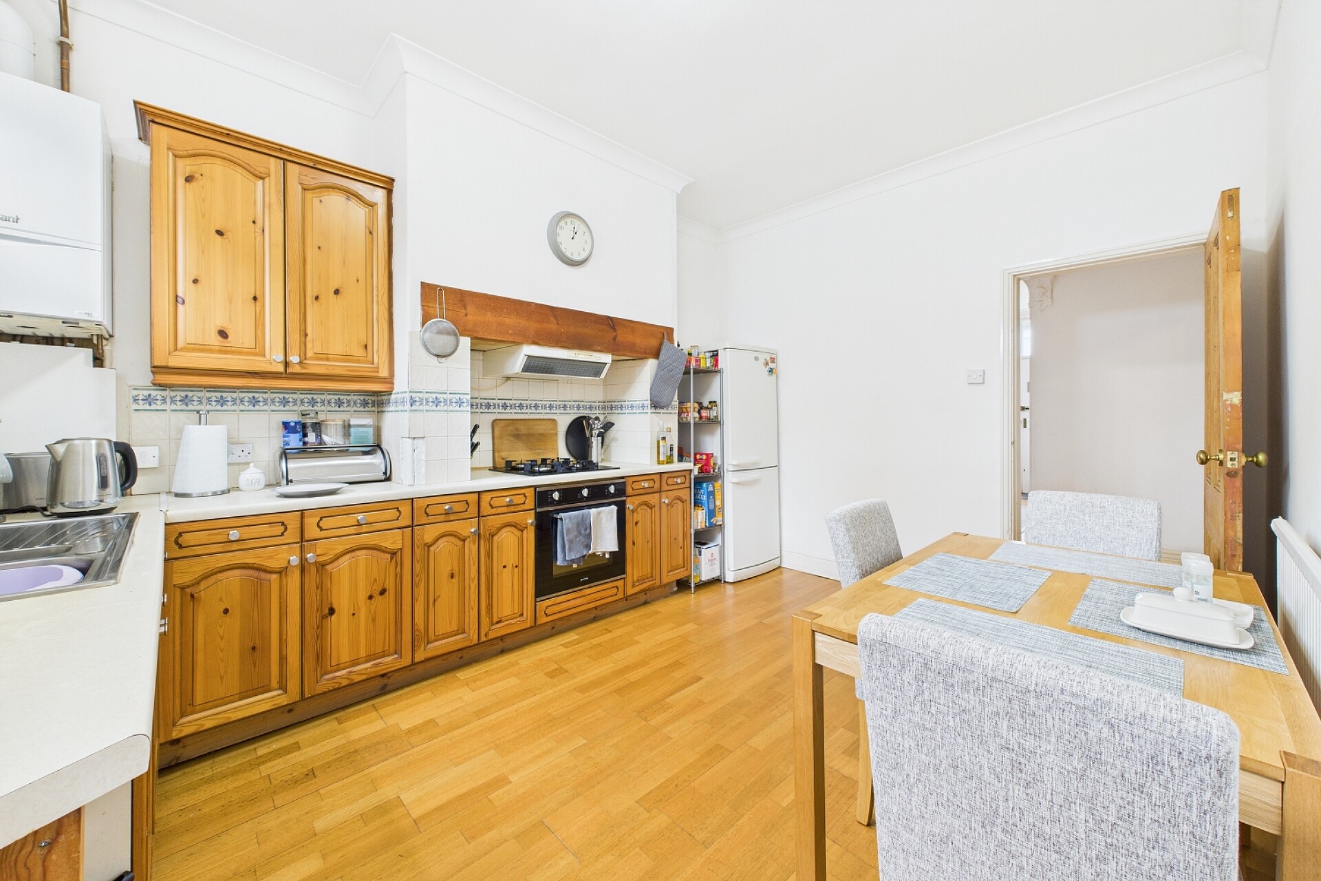 The large Victorian style kitchen has a high ceiling with light from the side entrance and high-level windows. The wide feature chimney breast with wooden mantel beam houses the gas hob with circulatory extractor and built in oven. There is a range of fitted base units in pine. There is ample space for free standing fridges and freezers as well as a dining table and chairs.